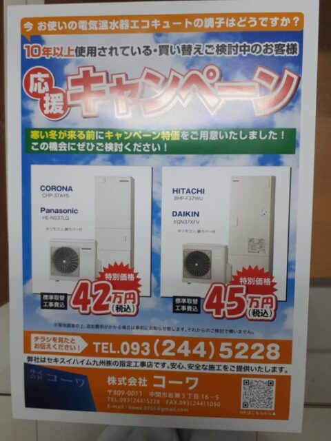 12月も残り2週間を切り慌ただしくなってきました。これから寒くなるにつれて給湯器の故障が増えてきます。冬の季節にお湯が出なくなるのはとても辛いと思います。10年以上お使いの給湯器は部品も代わり修理がきかない場合もあります。なんか近頃お湯がなくなるのが早いとか異音がするとか前兆がみられる方に朗報です。私達初めてキャンペーンを行います!チラシを作ってポスティングします。このブログ見られた方も対象ですのでこの機会に是非ご検討下さい!宜しくお願いいたします!